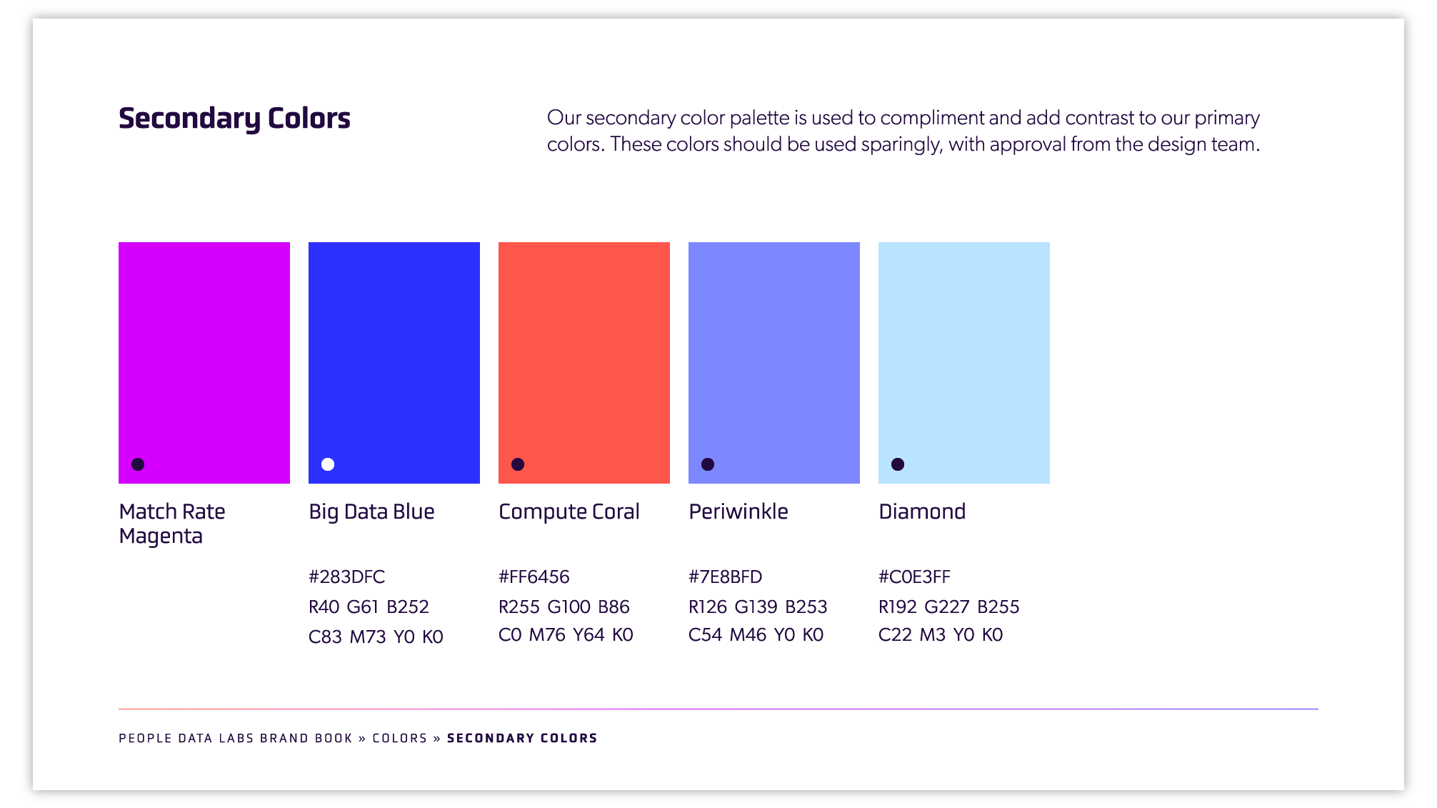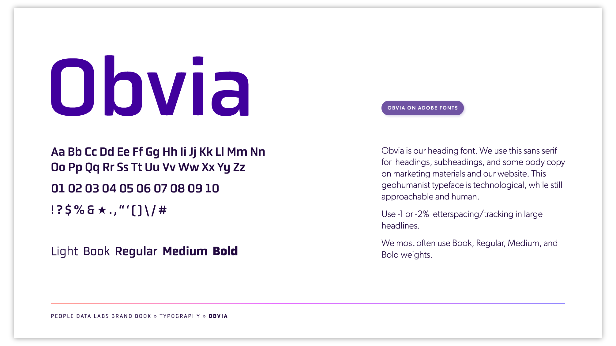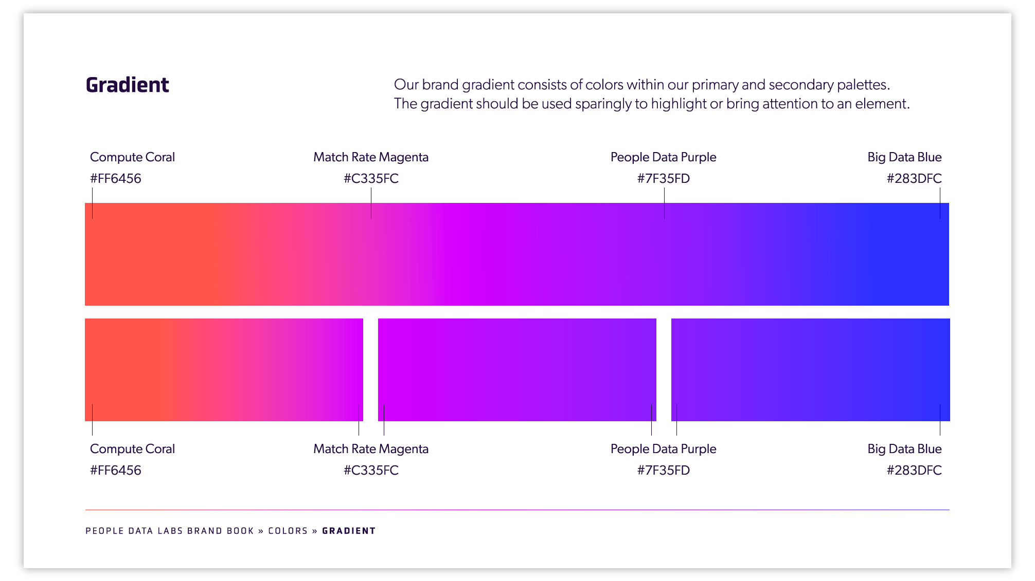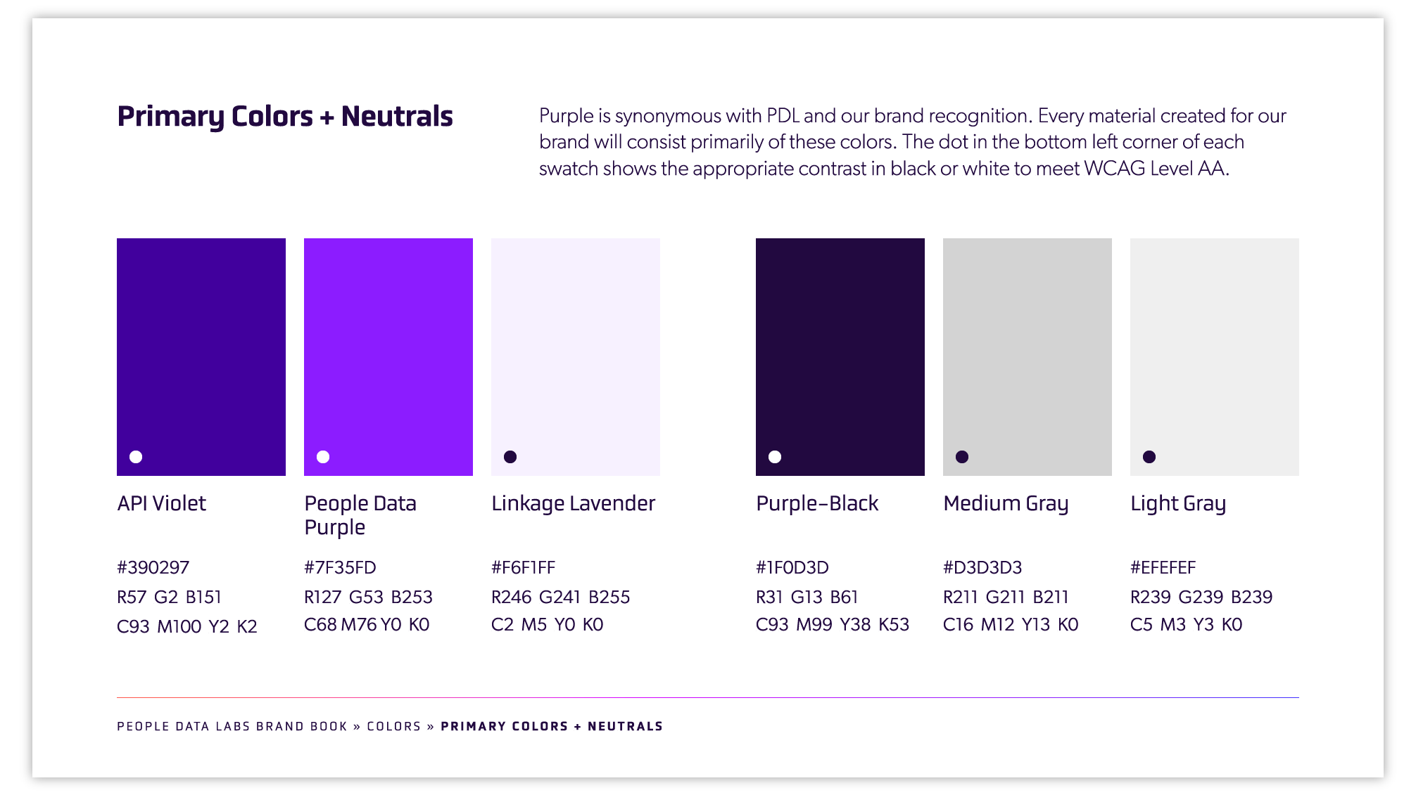 Purple was synonymous with People Data Labs, and I built a bold, bright palette of colors around the purple hue, including gradients and tints that would be used in illustrations, infographics and data visualization. I chose contemporary, tech-leaning fonts for an elegant, versatile typography kit.