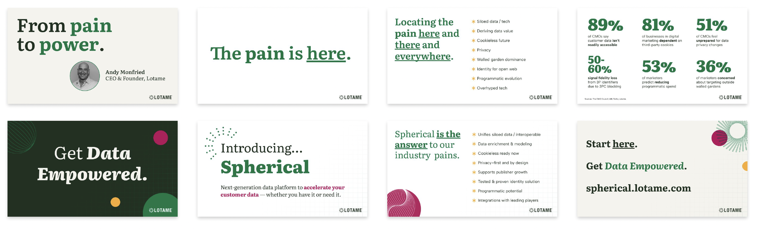 Working closely with c-suite, the Sr. Designer and I developed this punchy keynote deck to announce the company’s launch of Spherical Platform. Our goal was to drive critical talking points and use color and shape to create excitement over the surprise reveal.