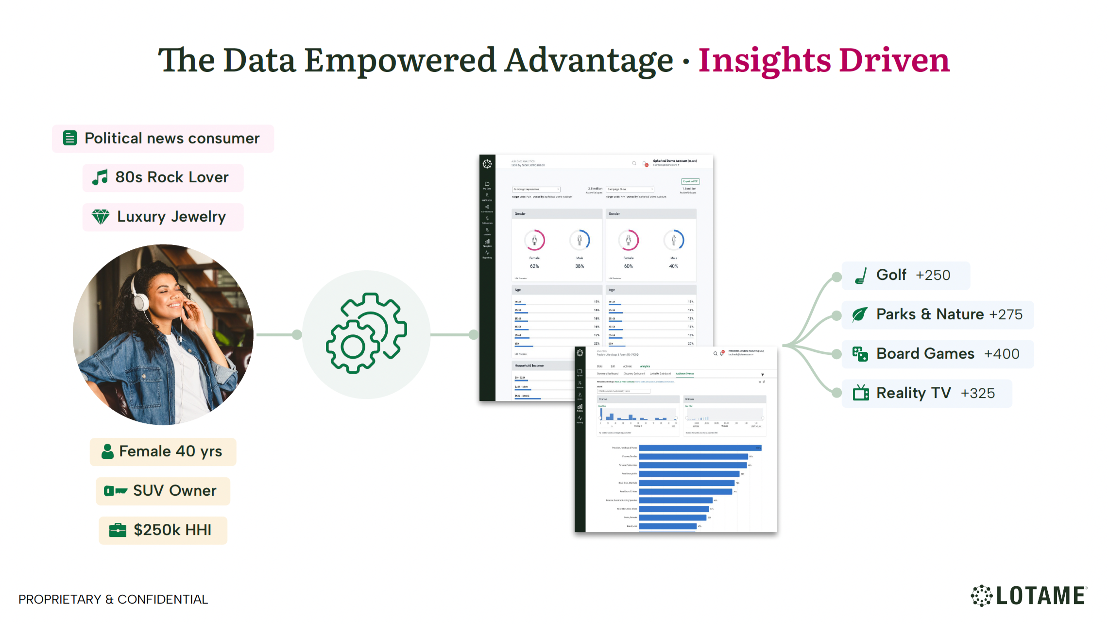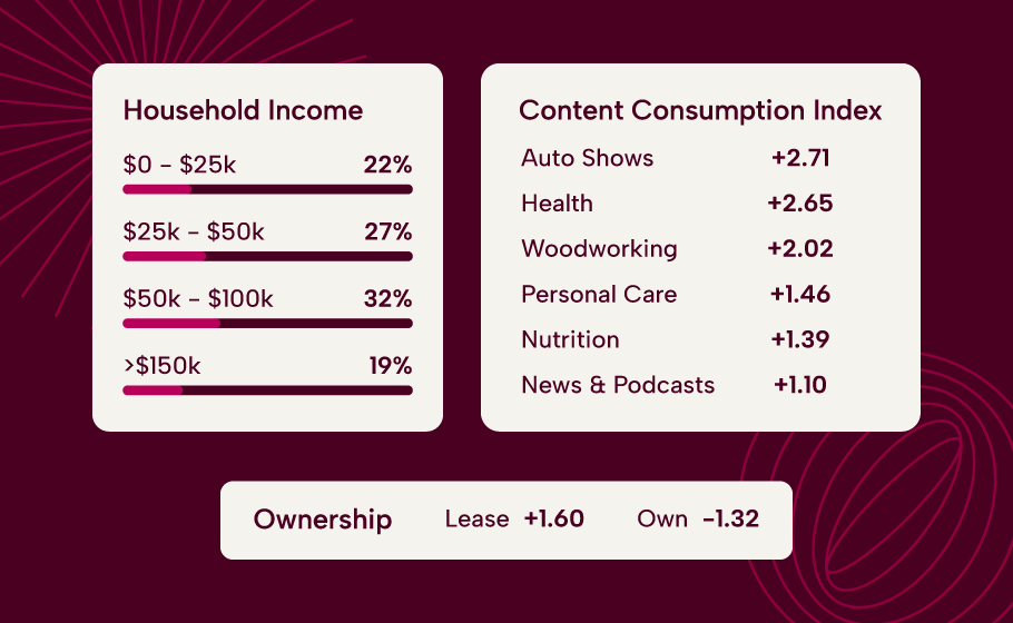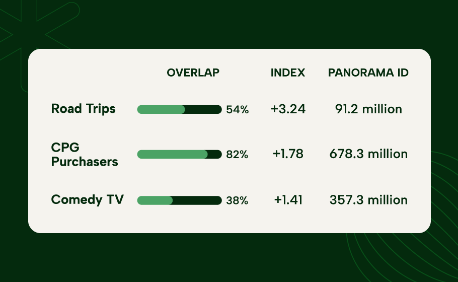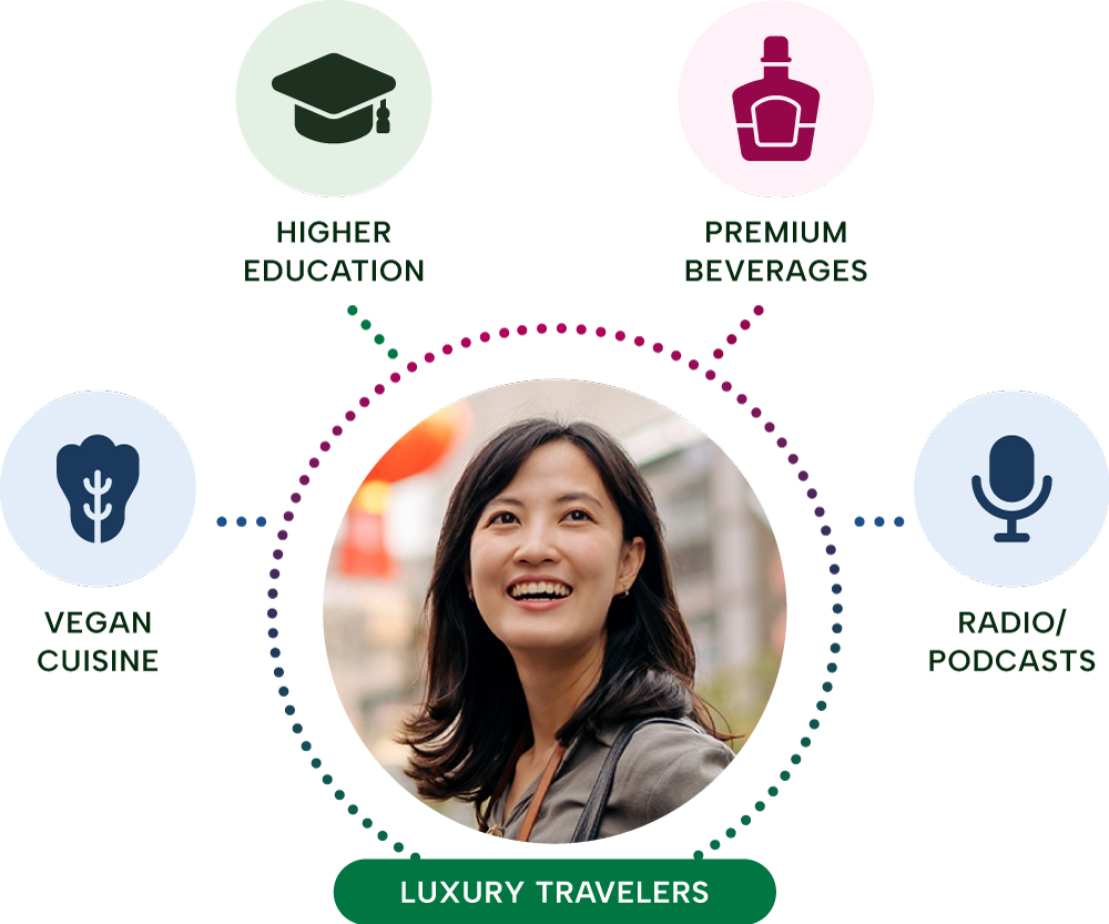 This visual illustrates our curation solution, where Lotame’s audience insights reveal unexpected connections between highly indexing behaviors and interests. For instance, luxury travelers index highly for vegan cuisine and podcasts.